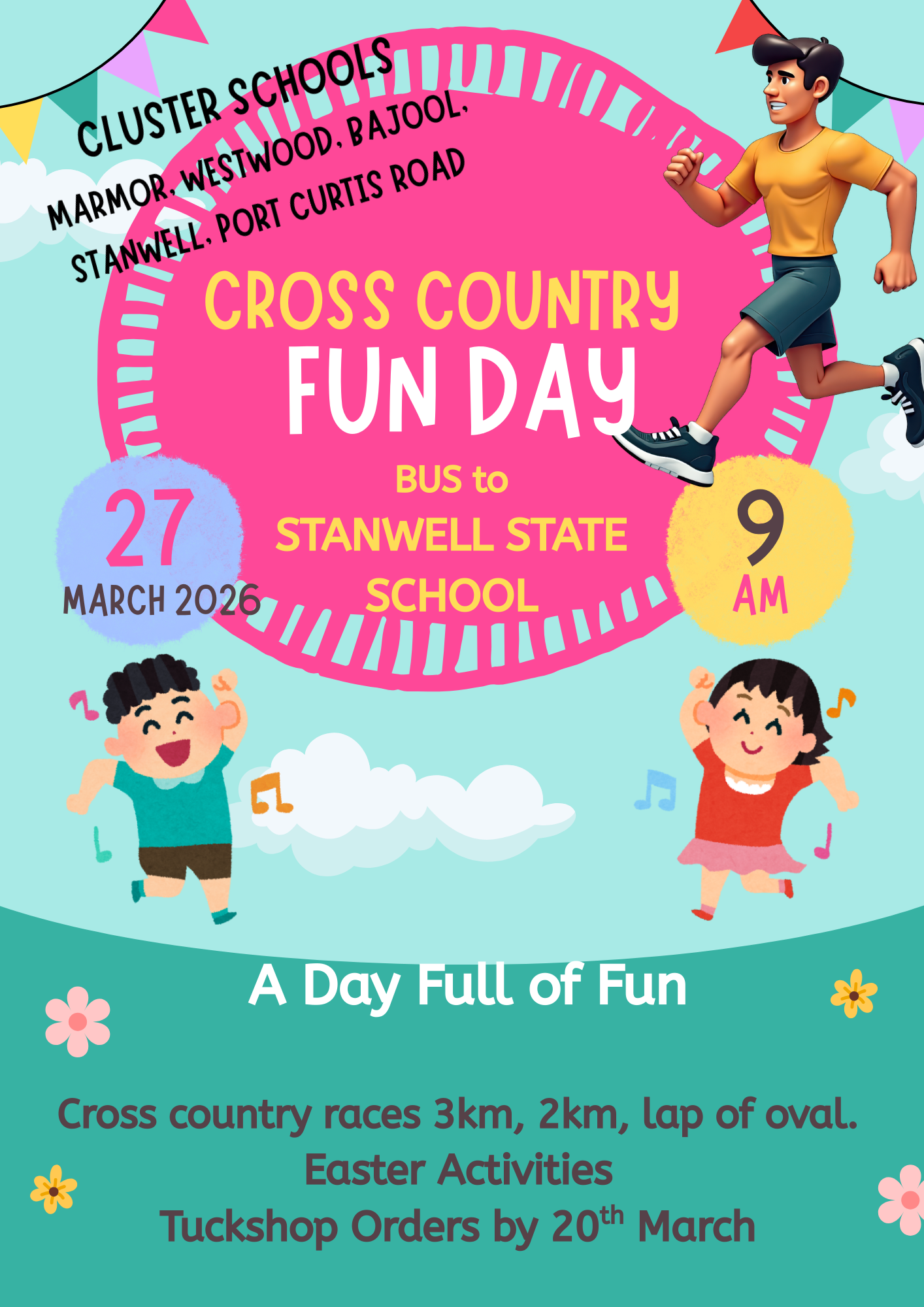 Cross Country at Stanwell State School, Friday 27th March, Bus leaving by 9am and returning by 2:45pm. Fun day for all.